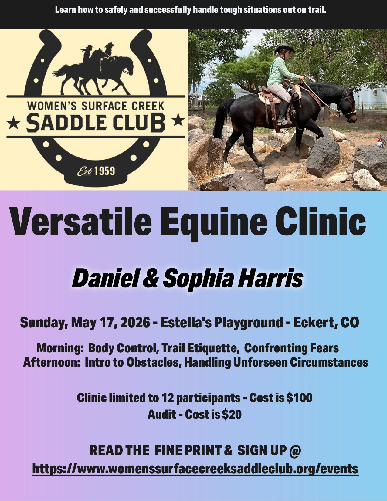 Join the Women's Surface Creek Saddle Club for a full-day, hands-on clinic designed to make you and your horse a confident, capable team — whatever the trail throws at you.